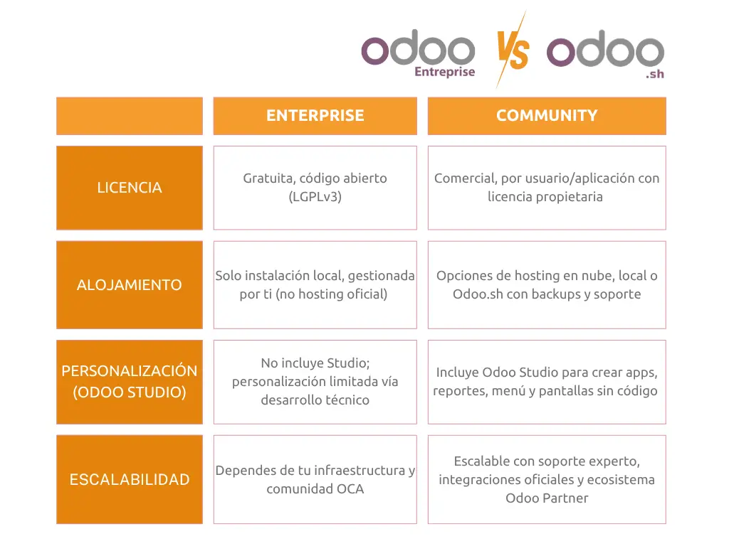 Odoo Community es la versión, mejor dicho, el núcleo sobre el que está construido Odoo Enterprise.